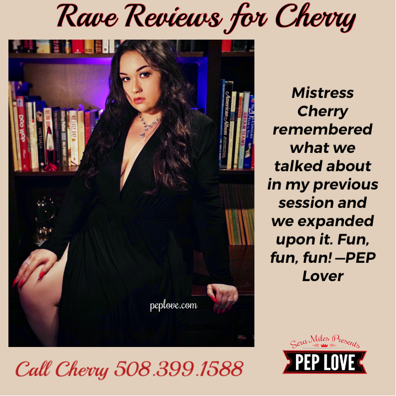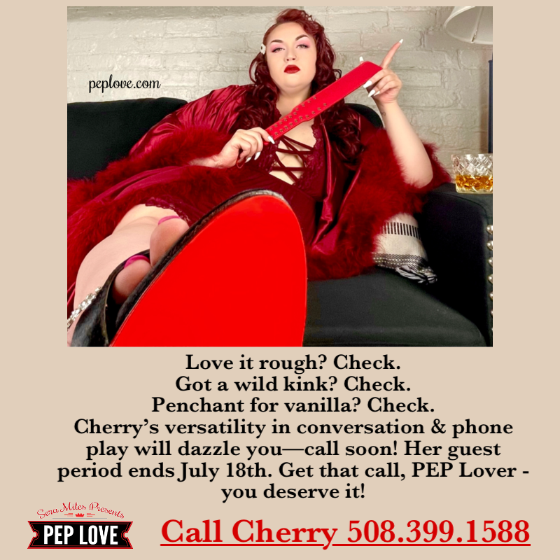 Cherry's long had a penchant for MommyDomme fantasies, but in her three months at PEP, she's uncovered a new love for incest role play in fresh & dynamic ways, too! You'll have to call & ask for details. Cherry's fetish list was already long, & we love how open she is to exploring MORE fetishes. "Treat yourself to making all of your wildest fantasies reality even if you don’t see your kink listed on my page," she says. "Allow me to be the escape you’re so desperately searching for. You deserve it, lover."