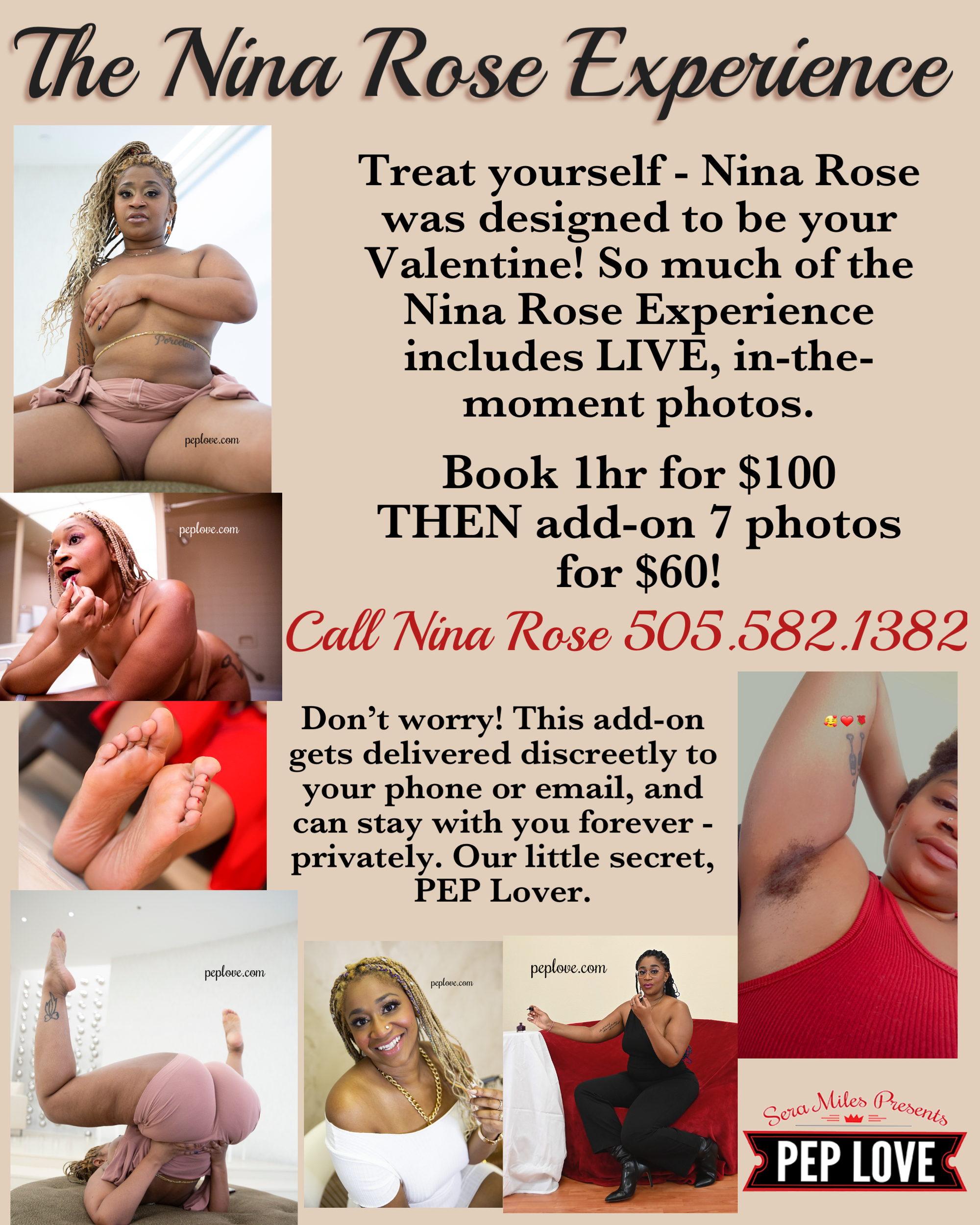 Be sure to follow @Sera_Miles_Presents on the Insta, as well as Nina's NEW Insta account, designed for PEP Lovers: Executive.Liaison. We LOVE connecting with you, and it is our pleasure to develop more and more ways to stay connected! On that note, when you connect with Nina this month, book her $100/60-min Anniversary Special, and add-on 7 photos for $60! That $160 Nina Rose Experience is available all thru February, over and OVER!
