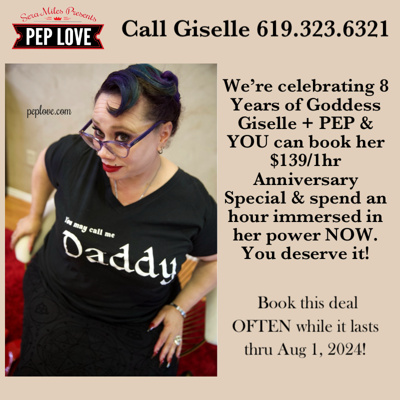 PEP Lover, anniversaries only cum once a year, & we want Giselle & PEP & YOU to have many, many more! This is the month to reach out & go for it—to go all the way w/ Goddess Giselle! Peruse her PEP Portfolio. Visit her updated photo album on FetLife. Let Goddess Giselle know how much you love to stroke for her, submit to her, & explore, w/ her guidance. Become one of the men she collects ;). Word has it she bites ... if you ask nicely.