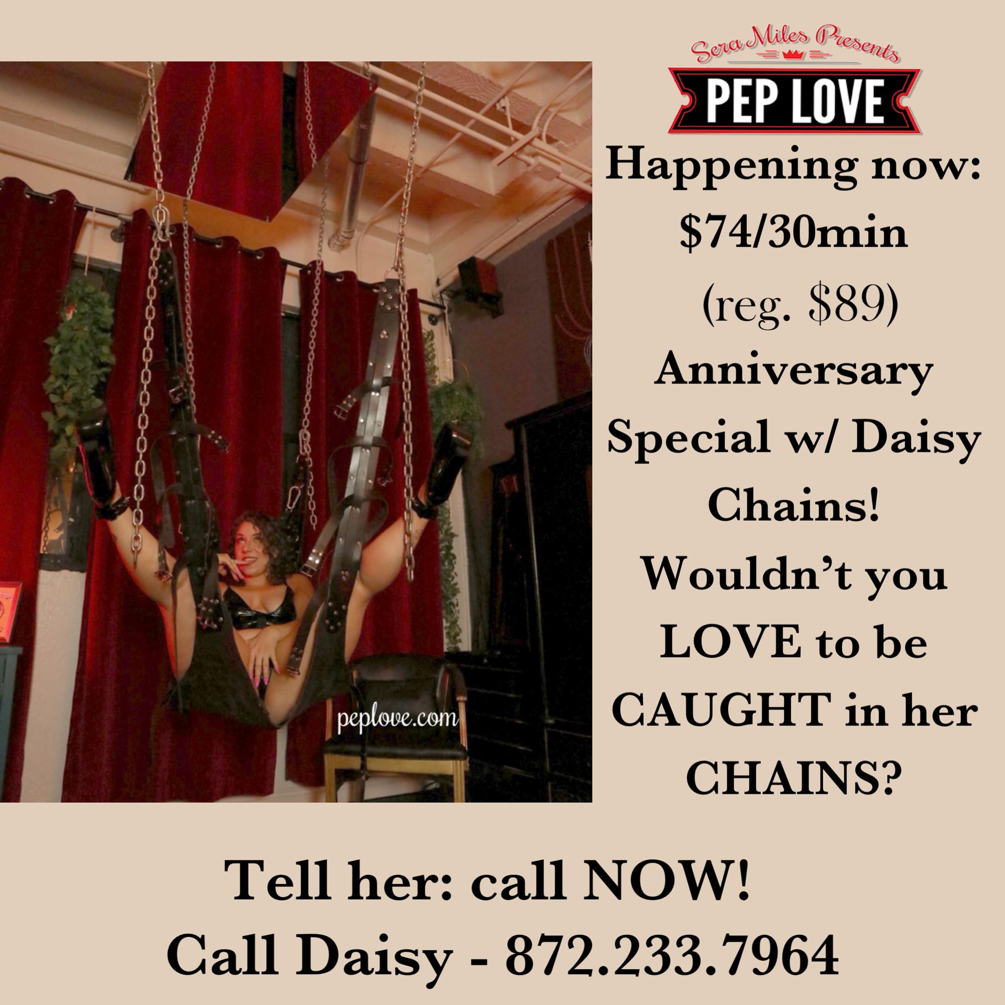 We're so thrilled to have Mxtress Daisy Chains on our #DreamTeam! You, too? Call & tell her ALL about it! Play hard, worship her soles, enjoy her sweet side AND her sadistic side ... most of all, join us in congratulating Daisy on an incredible inaugural anniversary, & wish all of us many more! (Beg. Plead. Whimper. You get our drift ... have FUN! Don't you deserve some fun?!)