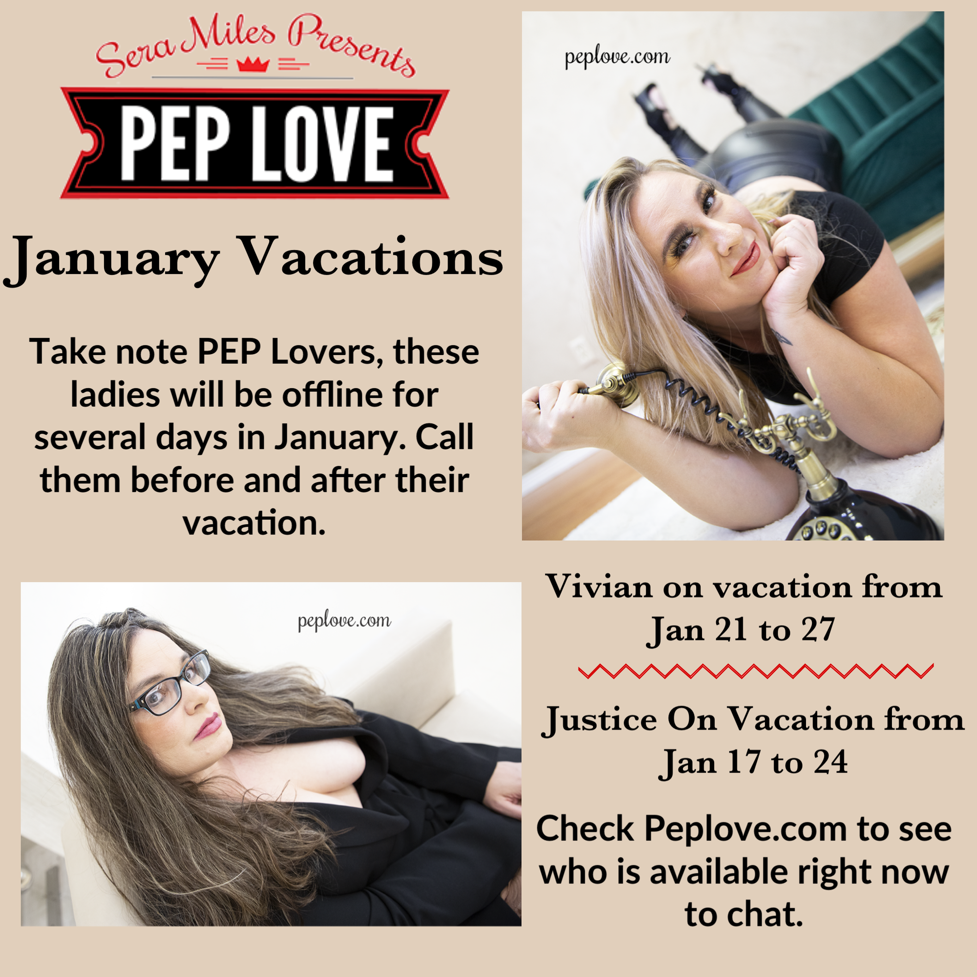 While you're deep in your calendar, PEP Lover, take note of Justice and Vivian's January vacations - if you've been hungry for a call with these Ladies, time is of the essence! Withholding we only recommend if your Mistress orders you to do so ;).