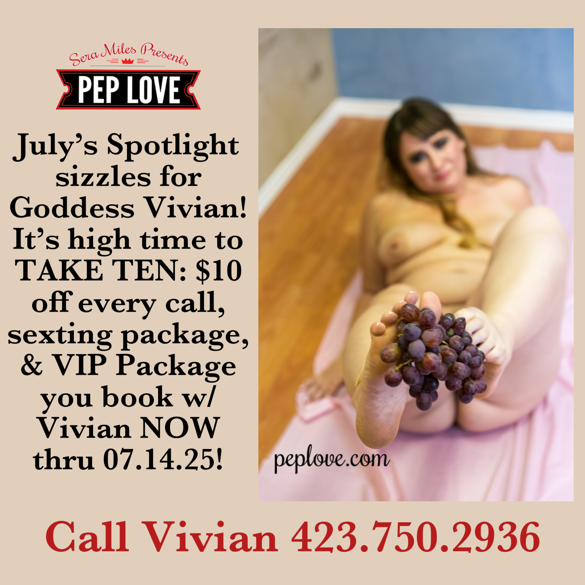 July's RICH w/ Goddess Vivian's Spotlight & Goddess Giselle's NINE year PEP Anniversary. PLUS, we have news about Emily Lane we think you'll love, & Sera Miles will be taking calls for three special days! Lady Victory V's entering her second month of guest starring, & we're ready to announce who's joining PEP cum August ... hint: PEP's going INTERNATIONAL! Read on for all the juicy details of our juiciest July to date!