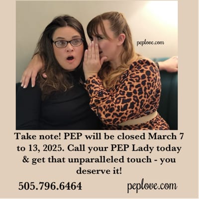 PEP Lovers, every March we close for a week, giving our Ladies a well-deserved chance to rest and rejuvenate. We want you to update your calendar now, call often now, and trust that upon our return, we'll be RARING to go, ROARING through March, and READY to take you on the most exquisite mind vacations ...