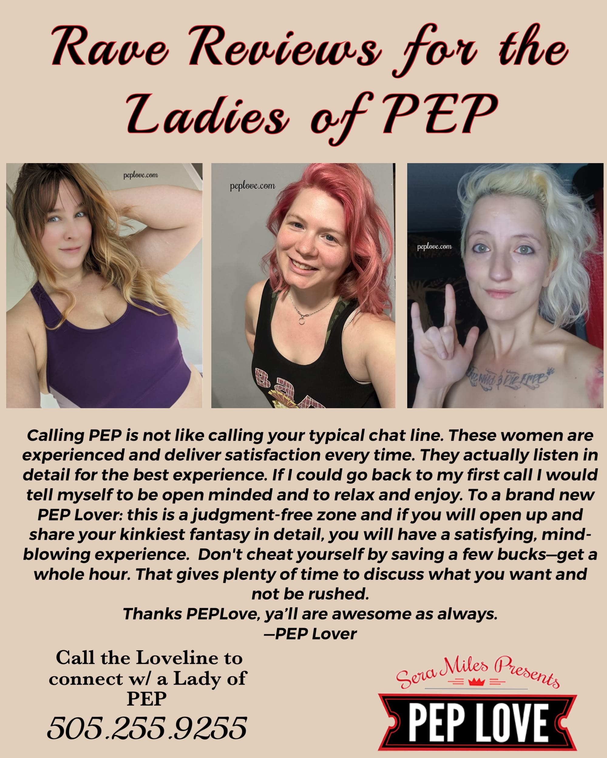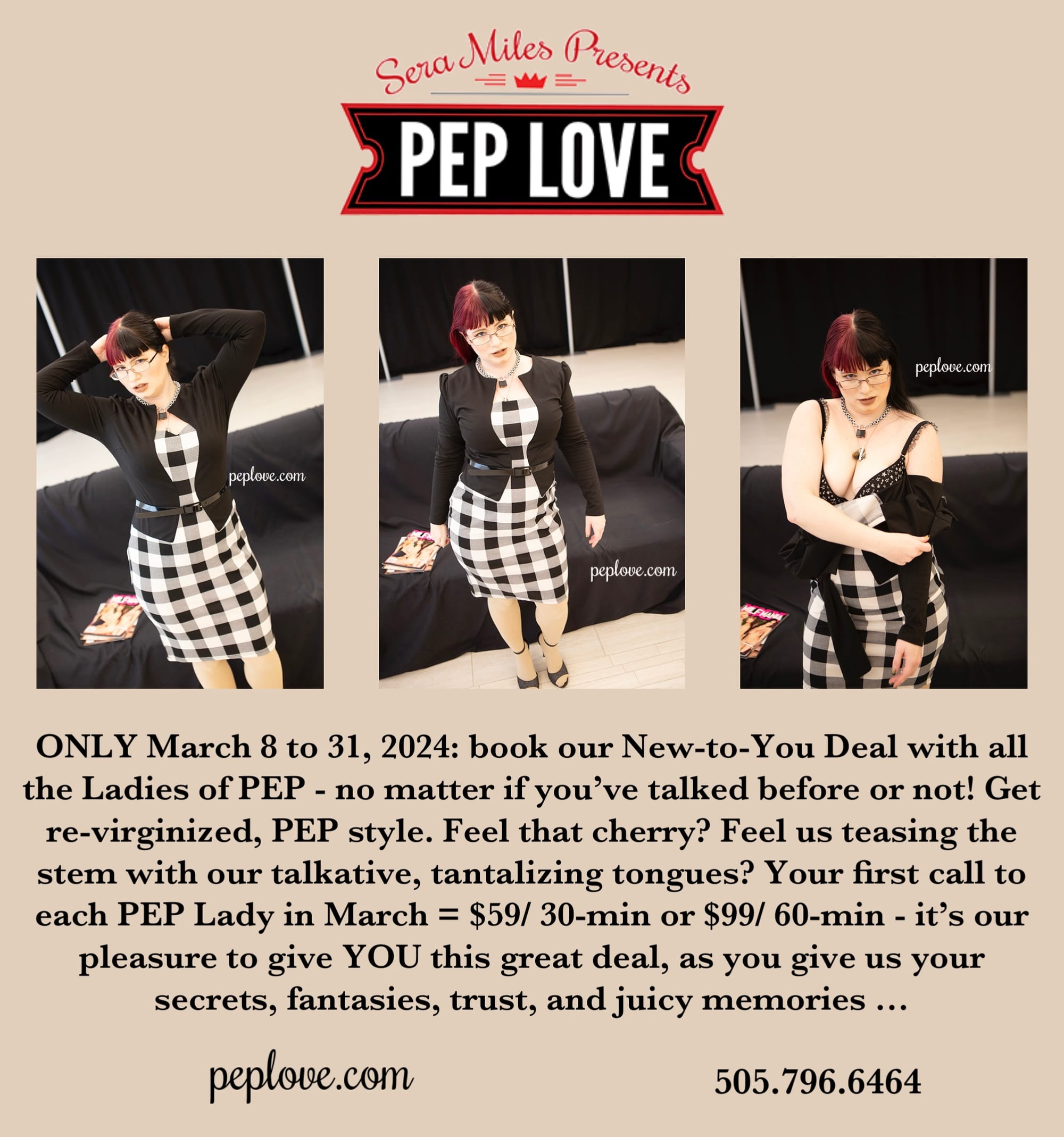 Do you remember being a PEP Virgin? Perhaps you made that first call excitedly, already dripping pre-cum; maybe you were nervous, and you almost hung up until you heard something like, “Hello, this is Sera”—and then you were in for life! PEP Lover, however you came to us, whenever you arrived, be that last year or 30 years ago, we are so thrilled to offer you that Virgin PEP Experience again, with every Lady at PEP! Through March 31, 2024, your first call to each Lady will be at our special New-to-You Deal: $59/ 30-min or $99/ 60-min (extensions also at these rates). We want you to savor the voice and unique mark of every Lady at PEP. This is the time to reach out to a Lady you've never spoken with before, and to re-connect with the Ladies who simply get you—and you deserve to feel understood.