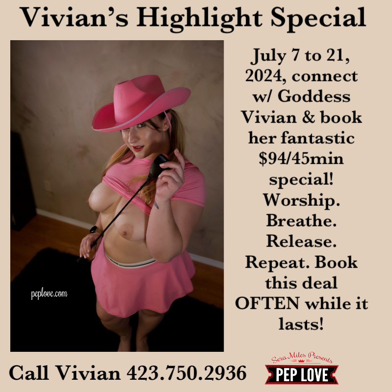 Let your inner girl OUT w/ Goddess Vivian. Playing hard ON THE EDGE w/ doses of joy & sensual pleasure is her sweet spot. Find yours, together. Call, PEP Lover. Call Goddess Vivian all weekend, book her sweet $94/45min deal, & treat yourself ... YOU DESERVE IT - xo