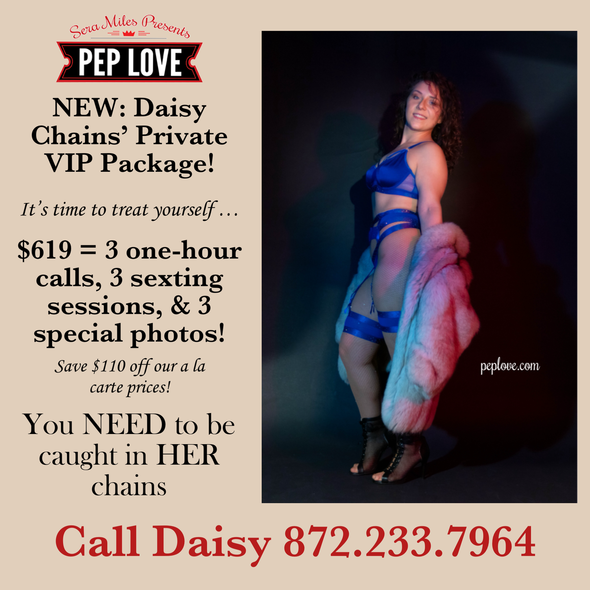 Gags, chains, hot sexting, lingerie, peek-a-boo shoes ... every fetish has a home at PEP. If you really want to impress Sera this month, call not only her, but also a PEP Lady w/ whom you've never before spoken! Our $69/30min New to You deal makes it even more comfortable to dip your kinky toes into a new pool of imagination & sensuality ...